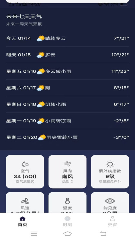 3、提供风度、湿度、气压、温度等全面天气数据,以及当天天气状态的详细描述。