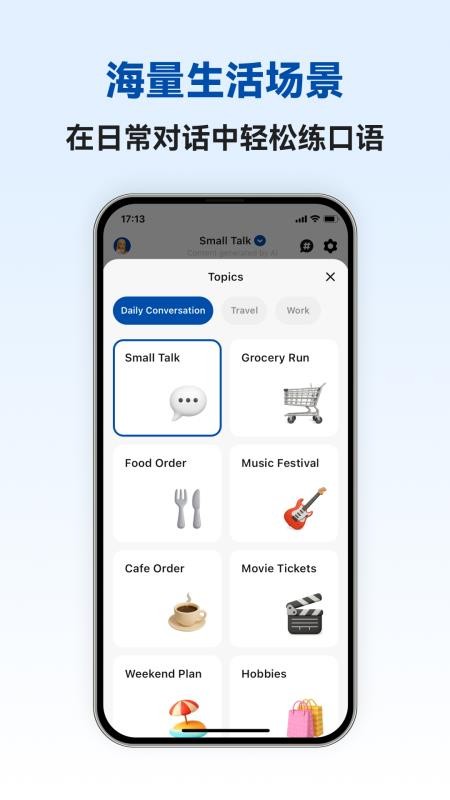 覆盖日常对话、旅行、工作和考试场景。丰富的话题库等你探索,满足你各种学习需求和兴趣爱好;