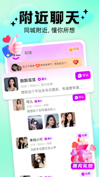 1、精准匹配:通过大数据分析用户的兴趣爱好、性格特点、地理位置等多维度信息,实现精准的交友匹配,让用户更容易找到志同道合朋友。