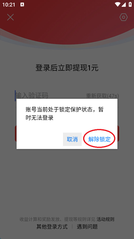 10、再次登录账号时,会显示,账号处于锁定保护状态,无法登录。想解锁直接点击弹窗右下角的“解除锁定”。
