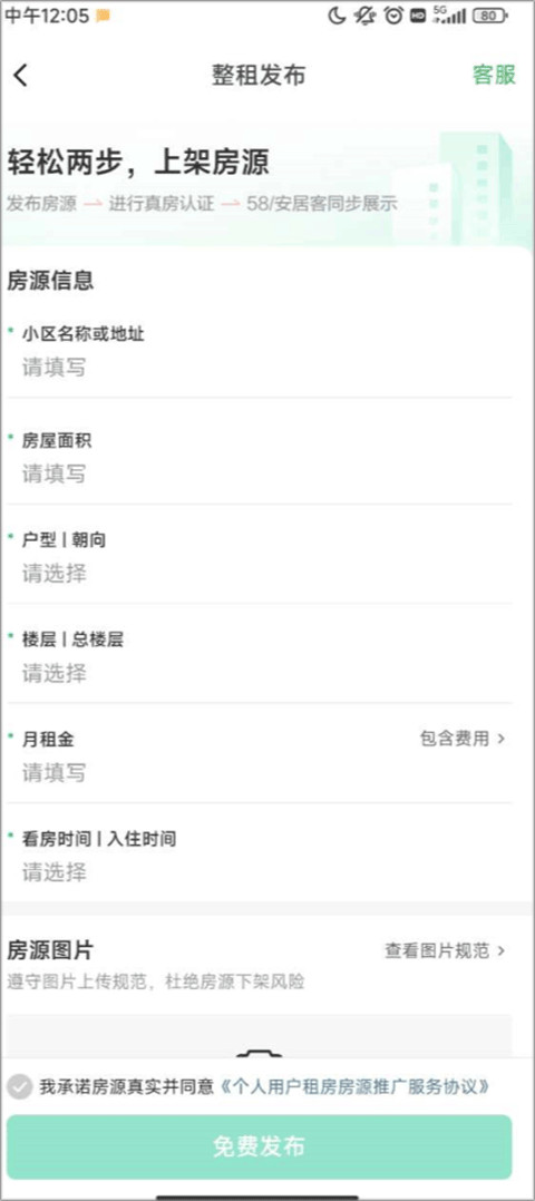 5、输入租房的信息,填写小区名称或地址、房屋面积、户型朝向、楼层、月租金、看房时间、房源图片进行发布即可。