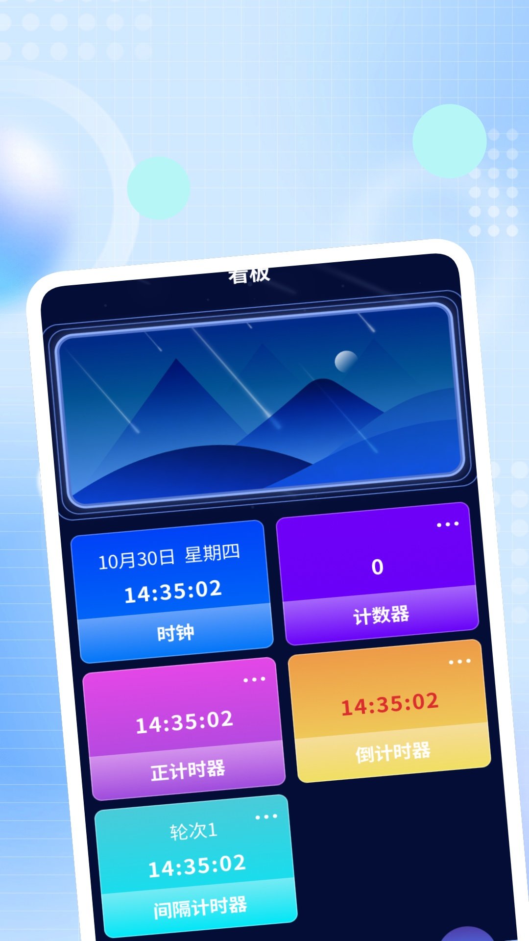 2、提供时钟、正计时、倒计时等多种时间工具,通过时间管理看板灵活切换,适配办公学习与生活计时需求。