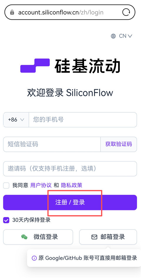 1、在手机浏览器中搜索【硅基流动统一平台】,进行注册登录,可以使用手机号直接登录。