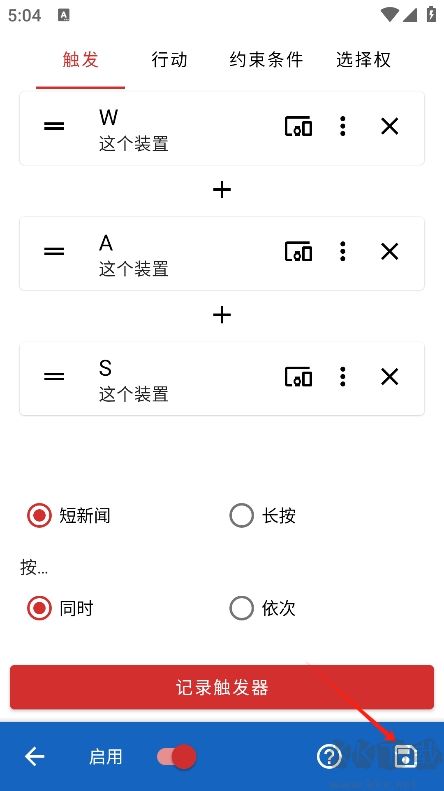 3、现在就可以记录触发器了,点击底部红色按键。
