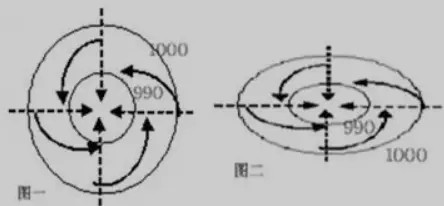 例如在右面的北半球气旋示意图中,在判断风向时,要注意在气旋的什么方位。一般在气旋南方则刮偏西风,在北方刮偏东风;在气旋西侧刮偏北风,在气旋东侧刮偏南风。
