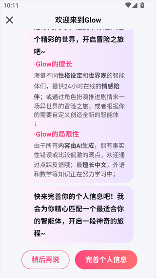 glow官方正版是一款搭载了人工智能聊天模式的社交类型软件。它的核心玩法是和AI角色进行对话,你可以设定角色的形象和性格,然后像和朋友聊天一样互动,聊得多了AI还会慢慢学习你的说话方式。对话节奏比较舒缓,没什么压力,适合想找个树洞说说心事,或者单纯想体验和虚拟角色互动的人。