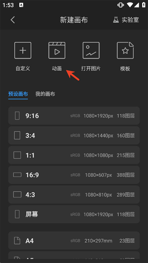 2、新建的画布中,有十分多常见的分辨率图纸格式,我们点击即可创建想相应的画布规格。特别注意的是,我们还可根据图片创建画布:导入需要临摹的图画,即可自动适配相同像素的画布。