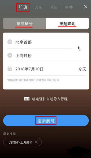 2、默认是添加航班的行程,可以按航班号或起降地搜索航班,当然航班号是*直接准确的