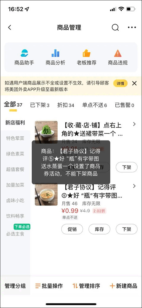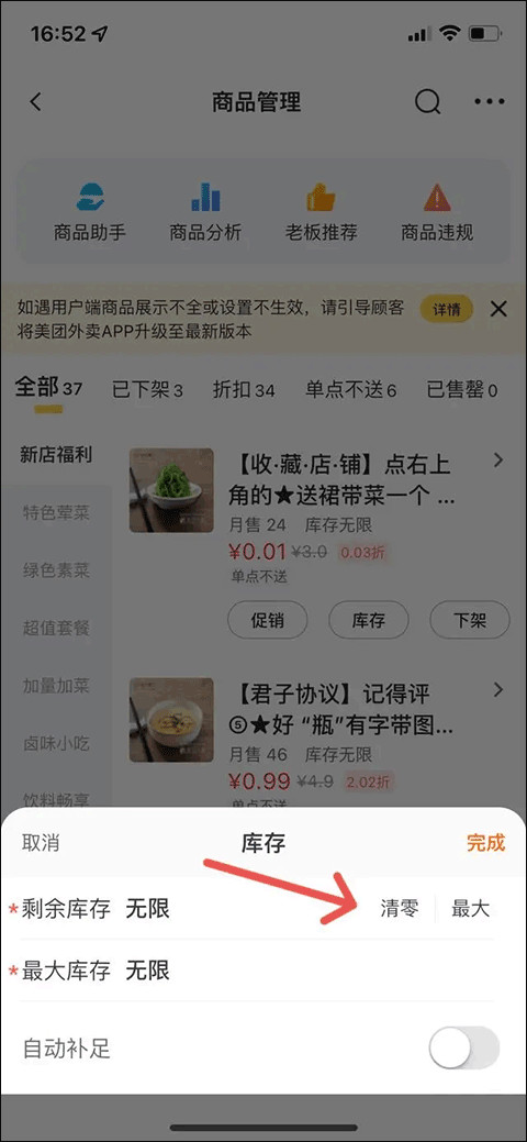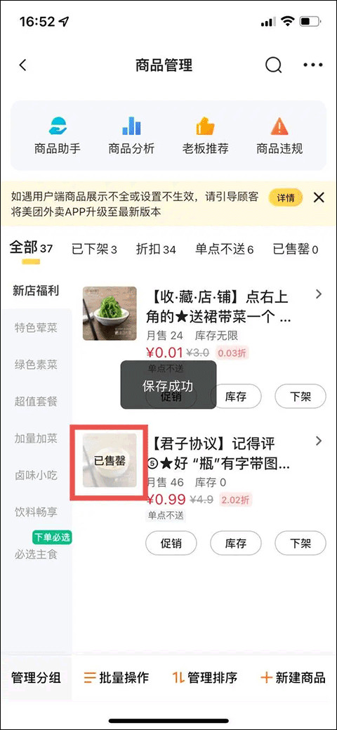 b、美团外卖商品卖完了,我们不能设置下架,但是可以把该商品的库存变为零,顾客那边也下单不了。