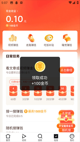 2.福利力度非常大,搜索内容并浏览超过15秒就能获得高额金币,新用户注册当天还有专属现金红包。