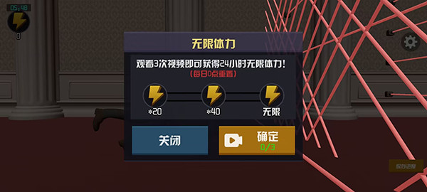 3、玩家在游戏中不仅要控制角色不断的前进,同时游戏内还设置了各种不同的障碍,比如激光射线等等,注意碰到机关角色是会受到伤害的,左上方区域可查看角色剩余血量,体力每十分钟恢复一点,离线也可后台自动恢复