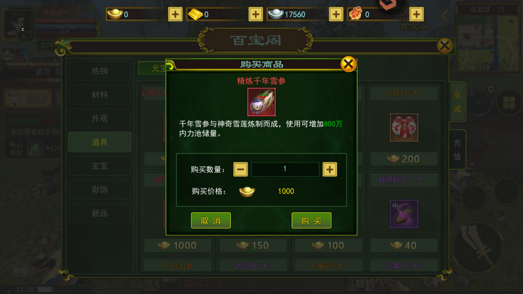 千年雪参与神奇雪莲炼制而成,使用可增加800万内力池储量。