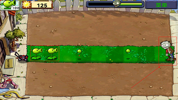 4、僵尸来临时,豌豆射手会自动攻击僵尸,我们的目的是防止僵尸进屋里;