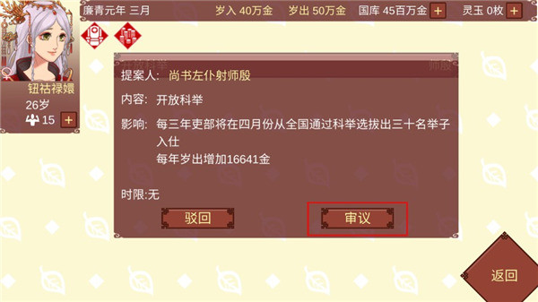 10、被你许可的奏章或是你自己想要推行的提案都会被放在内阁进行讨论,如果不能够获得内阁三人以上的赞同就无法通过。
