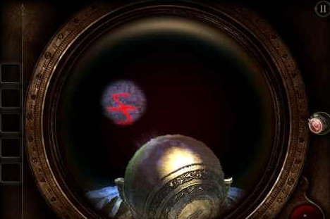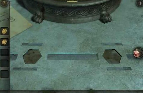记得镶嵌在八角桌上的三个图案吗?拉近奇怪的投影仪或者说探照灯,戴上目镜,去找这三个图案吧!第一个在左中,类似Z字母翻转过的图案。
