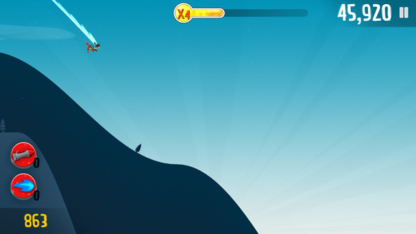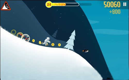 游戏屏幕上方会有此时的奖励状态,玩家通过在滑行中收集金币奖励、完成高难度动作等,可以填满奖励状态,从而激活各种高级工具例如火箭船等,还可以和企鹅、雪怪人一同搭载着火箭船奔向远方。