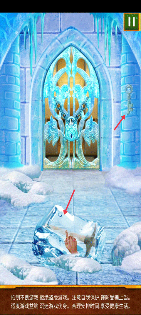 先滑动屏幕将冰块融化,获得里面的镐头,再将镐头敲击柱子上的冰块获得钥匙开门。