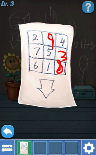 拿到向日葵花盆里面的图纸查看图纸,九宫格的数字谜题,推算出数字,从上到下应该是9、3、8