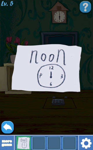 拿开地毯获得一把钥匙,使用钥匙打开小柜子,获得一张图纸,提示是noon,就是正午12点的意思