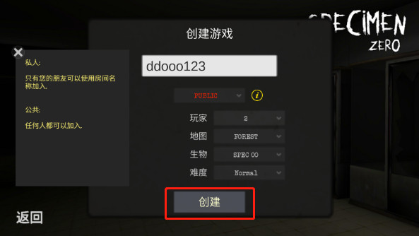 2、设置房间难度、玩家人数、地图、生物等各项内容后,填入房间名称即可点击创建