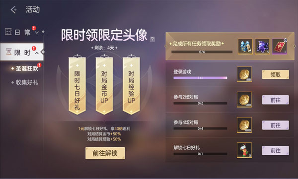 活动期间,对局结算金币+50%,对局结算经验+50%。完成任务,可获得圣诞福袋、金币等奖励;完成全部任务,更可获得圣诞狂欢头像自选箱、皮肤碎片、排位守护卡
