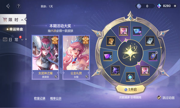 活动期间,使用龙晶购买获得幸运币,进行抽奖。奥黛丽·女武神之耀、女魃·公主礼赞、幸运星英雄自选箱、龙魂祈福卡、皮肤碎片、排位加星卡等奖励等你来抽!最多6抽获得一款皮肤,最多9抽可获得全部奖励,前2抽抽到皮肤的守护者会冠以欧皇称号