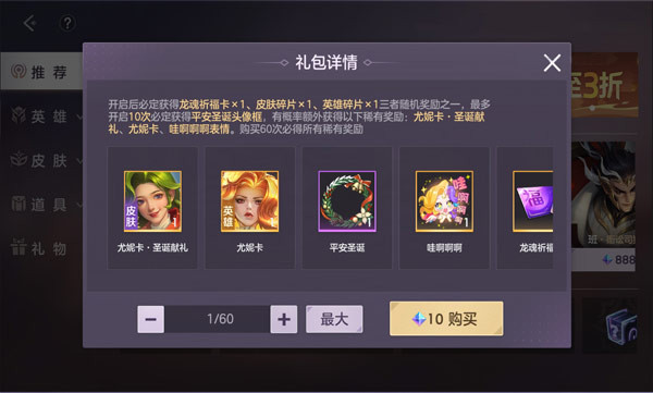 活动期间,圣诞福袋限时开售,尤妮卡·圣诞献礼、尤妮卡、平安圣诞头像框、哇啊啊啊表情等你来抽!最多60抽可获得全部奖励