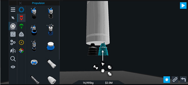 2、 检查火箭部件的缺陷并添加对称部件,对称模式可用于连接到燃料箱侧面的部件,它会在燃料箱的周围动态地创建克隆的部分。