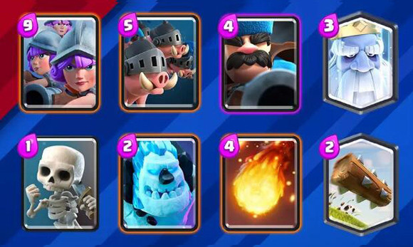 皇家猪是进攻核心,三枪是吃费反打利器,两张牌都吃火球,要学会在用一张骗出火球后用另一张做更多的事。幽灵可辅助进攻,猎人+小骷髅+冰人则要完成一切看似不可能的防守任务。此套牌实在非小编所能驾驭,就让秋季赛MVP Auk为你亲自讲解吧!