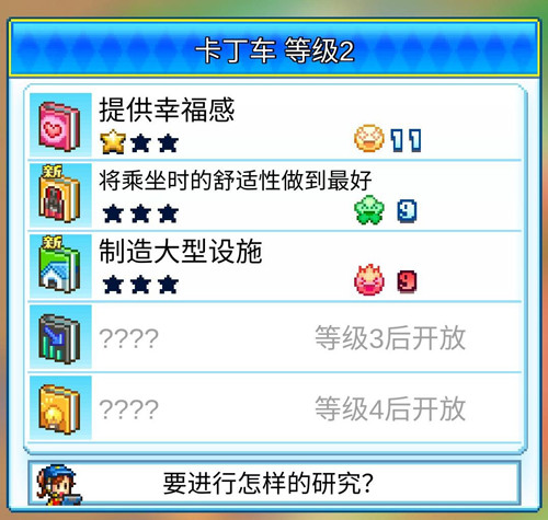 游乐设备和区域能通过研究提高人气以及门票价格,另外,在研究中具有以一定概率能获得提高乘坐舒适度、延长闭园时间或者降低维护费等特别的功能,不过也有可能失败。