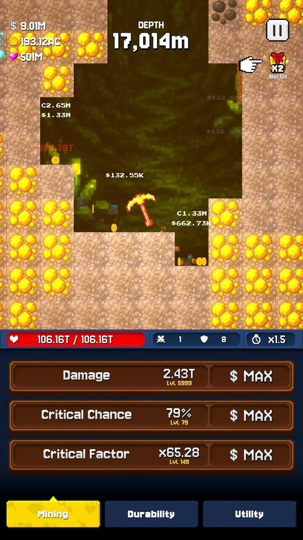 2. 倍数加成效果在关键阶段使用更有优势,在短时间内获取更多矿石与金币