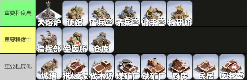 游戏中的建筑按照类型共分为生产类、军事类、功能类三种,其中军事类建筑的提升优先级最高,能综合提升我们的部队实力,也是提升核心建筑【大熔炉】的关键。