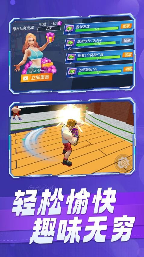 无限荣耀格斗是一款拳击主题的休闲动作游戏,你将从新人开始点击训练提升力量,不用复杂操作就能在擂台上打出爽快连招。游戏里可以买食物恢复体力,还能挑选装备让角色更强。不管对手多强,找到攻击时机就能获胜。每天登录领钻石,完成训练还能拿奖励,帮你更快成为拳王。