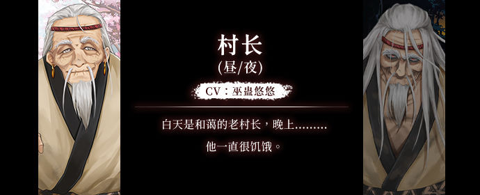 白天他是和蔼可亲、热情好客的村长。擅长钓鱼和与年轻人谈话,在村中资历很高,家家户户的情况他基本都有所了解,名副其实的“老村长”。