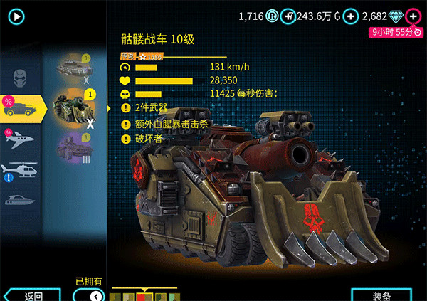 Top1骷髅战车:之前活动的奖品。目前游戏里威力最大的载具。主炮可以秒杀任何载具。副炮既可以对空也可以对地。拥有碾压技能,可以压扁其他载具。缺点是速度实在是太慢。开不快。
