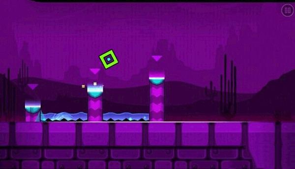 这种场景中玩家要想过去的话不能等方块跳上第一个桩子后松开右下角触屏再点击,不能是有节奏的点击-松开-点击,那样是过不去的,而是等方块跳跃上第一个桩子时,玩家按住右下角不放开,方块就会进行三连跳,跃过去。
