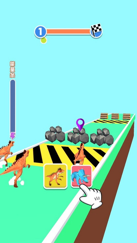 2、游戏开始,在恐龙奔跑竞走的过程中会有各种障碍、机关, 玩家可根据不同的地形选择变异的恐龙来通过关卡完成挑战。