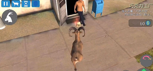 拿到巧克力面包后,系统提示我们用火燃烧面包。马路对面有个油桶已经被点着了,我们穿过马路走到油桶前。面包被卷在山羊的舌头上,够不到火源。我们尝试多晃动几下,或者是可以让山羊在油桶前跳几下,这样面包就会随着上下摆动。多操作几次,巧克力面包就可以碰到火源,然后就燃烧起来了!