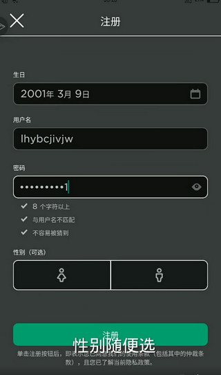 2、到了这一步就是填写信息,设名字和密码,密码不能和名字一样,生日需满18岁,其他的随便你怎么填!