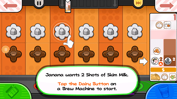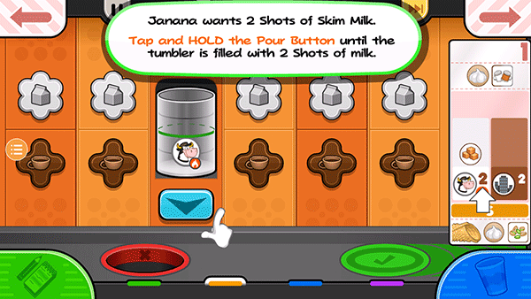 6、Janana要两杯脱脂牛奶。点击并按住倒奶按钮,直到玻璃杯装满2杯牛奶