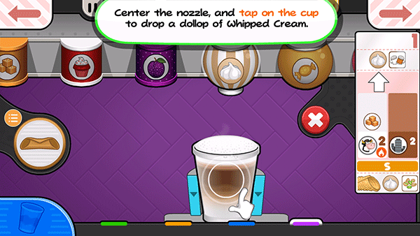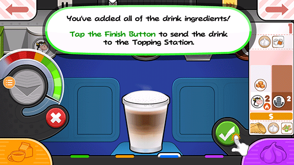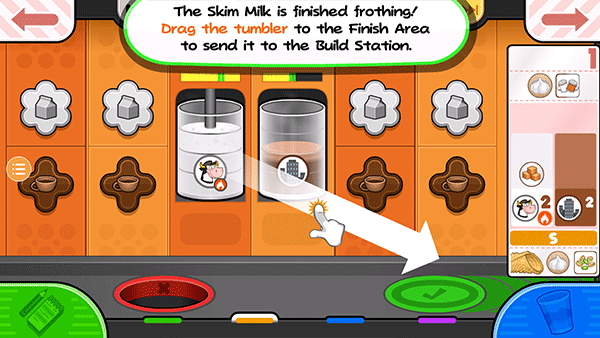 15、从小票左边的项目开始拖动容器,使左边的脱脂牛奶杯喷嘴在杯子上方居中。按住倒奶按钮继续添加脱脂牛奶!如果仪表接近红色区域,释放倒按钮,等待指针下降,然后再倒更多!
