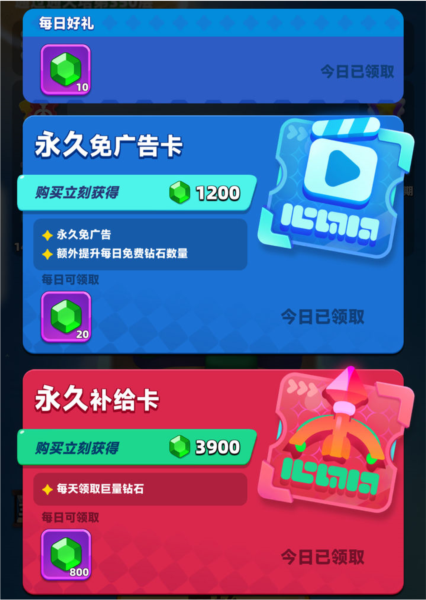 2.永久补给卡:每日可领800钻,直到游戏关服,早买早享受。(推荐时间党入一个,钻石主要来源)