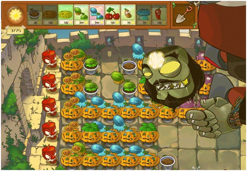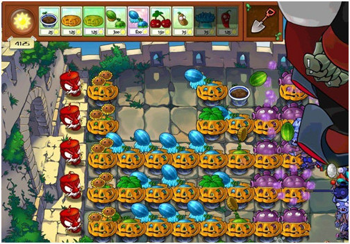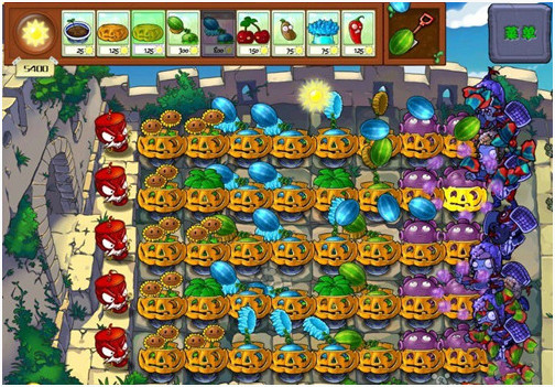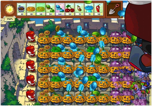 阵型出来后对付普通僵尸基本没什么花头,只要保证火力足够、南瓜换的及时、阳光够用,就OK(南瓜CD时间不够用可以选个变身茄子,这样就有两个南瓜了)