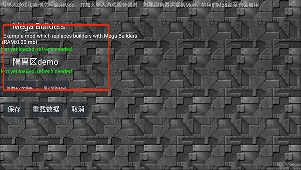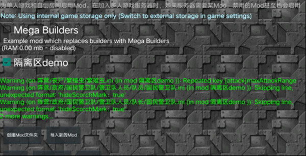 1. 下载并安装游戏后,在主菜单页面点击“模组”,找到“隔离区demo”,勾选前面的方框,点击“保存”即可成功导入隔离区模组。