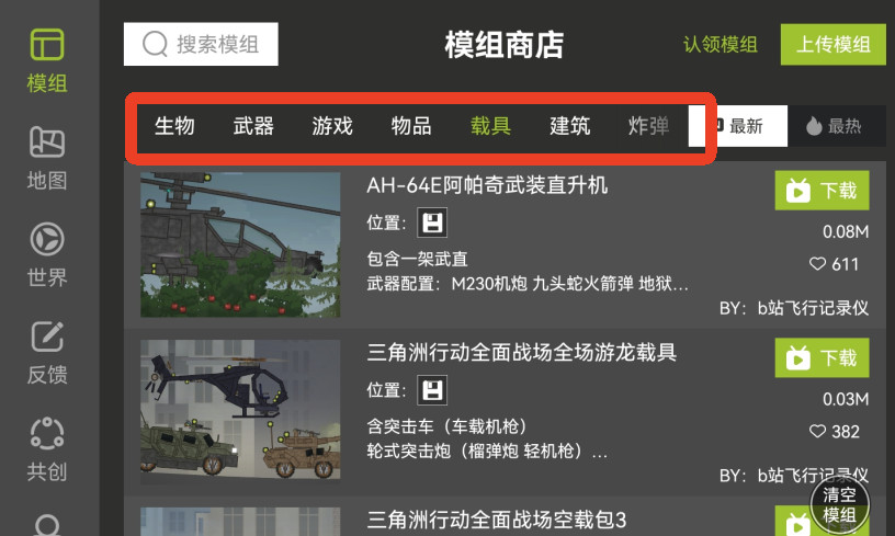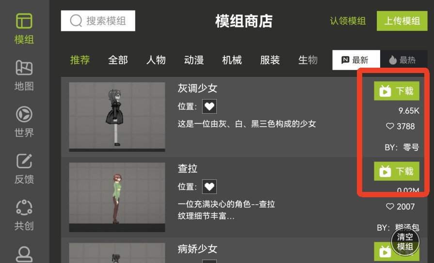 3、打开就是模组商店,点击右边的绿色【下载】可以下载你喜欢的模组,需要观看30秒的广告才能解锁。