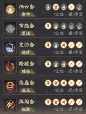 宝墟·雅:神鸟有减技能,降低攻防等,推荐上阵有单体输出、净化效果的名士。掉落文曲套、栖云套、市隐套。