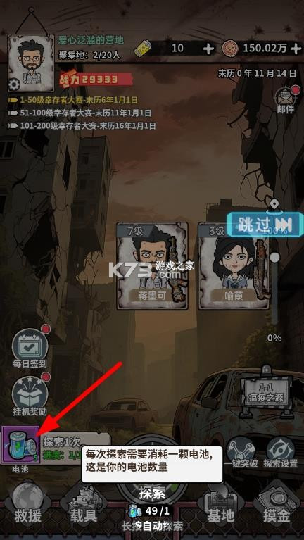3.每次探索消耗1颗电池,左下角可以看到电池数量;