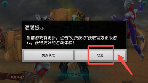 1、打开奥特曼传奇英雄破解版,游戏不用登录即可畅玩,注意不要更新,点击【取消】!