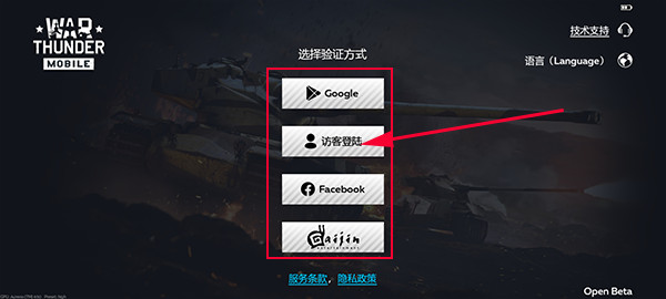 5、目前游戏支持以下四种方式登录,其中第二个“访客登录”可以不用账号,使用游客的身份直接进入游戏,小编这里使用的就是这种登录方式