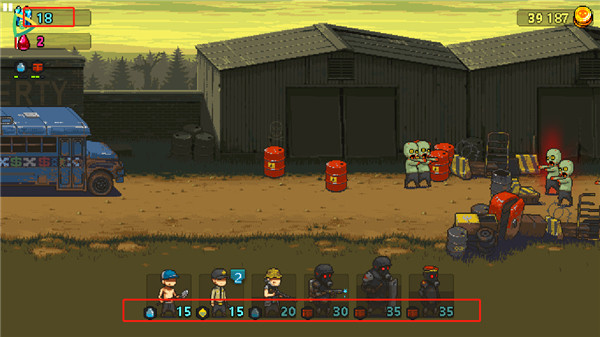 在战斗中,需要蓄积一定的能量值才可以派遣士兵,越强大的士兵需要越高的能量值。这种能量值显示在屏幕最左上角,随着时间的增长匀速增加,有时候打败僵尸也会掉落能量包。3 种增益工具位于屏幕中央的正上方,其中,蓝色能量桶能起到快速补充能量的作用。